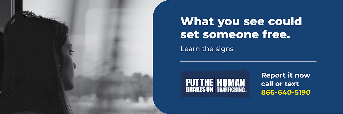 U.S. law defines human trafficking as the use of force, fraud or coercion to compel a person into commercial sex acts or labor against their will. According to U.S. Department of Transportation, an estimated 27.6 million men, women and children are sold into prostitution, domestic servitude or other forced labor worldwide. Human trafficking often hides in plain sight. Traffickers use our transportation systems, including trains, buses and roads, to move their victims. Being aware of this reality is the first step towards making a difference.